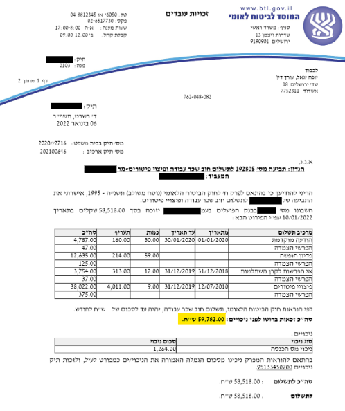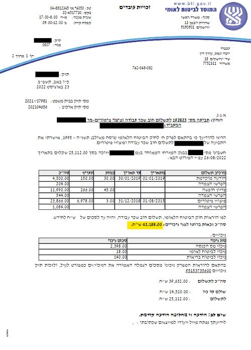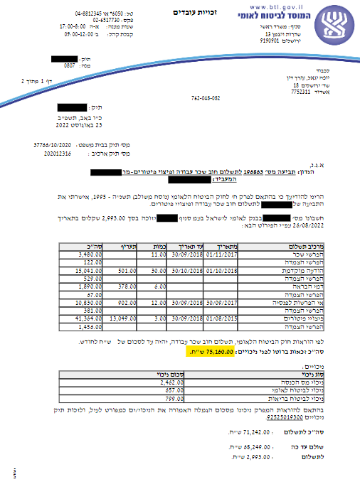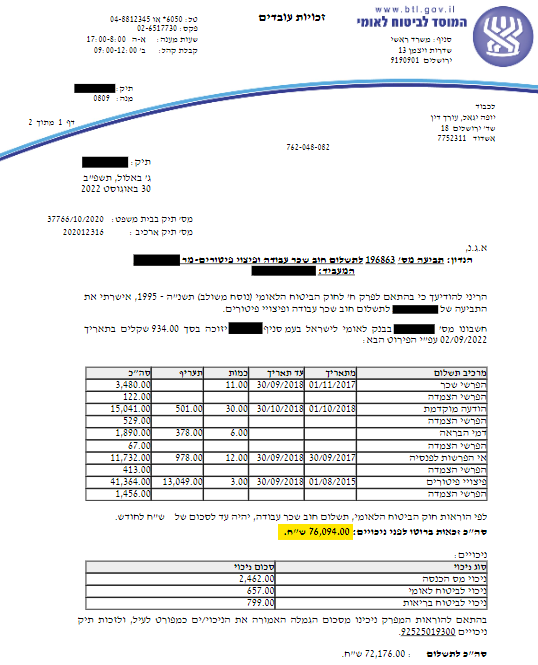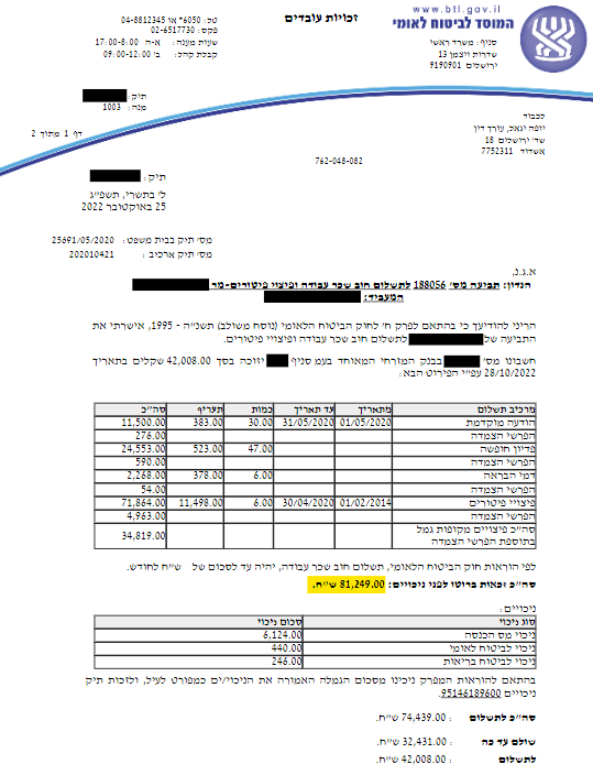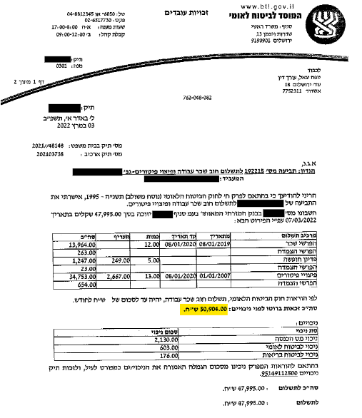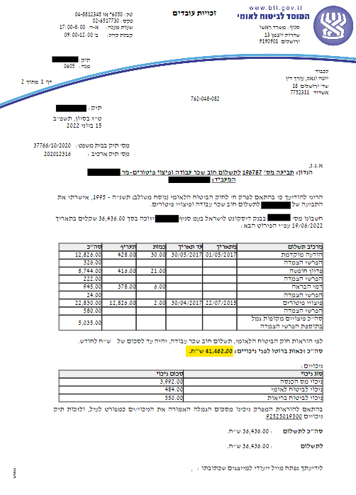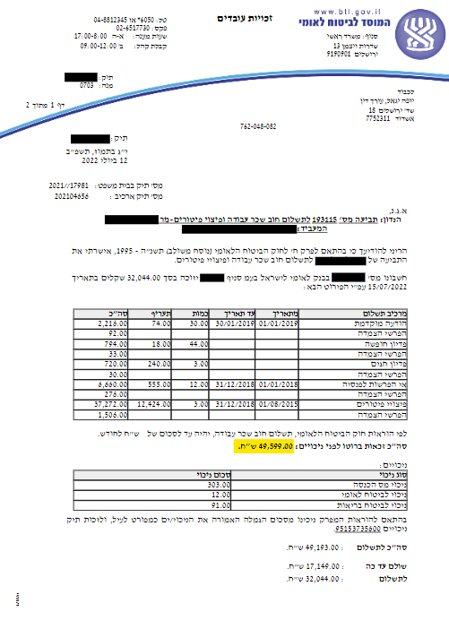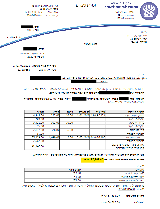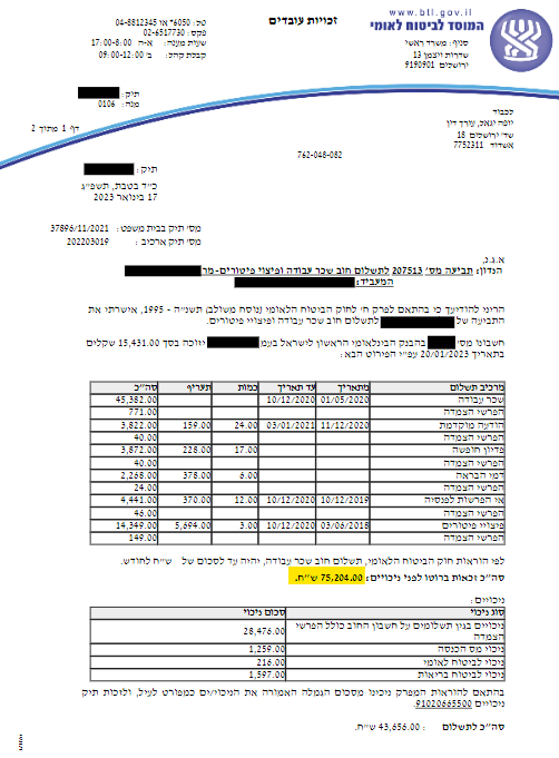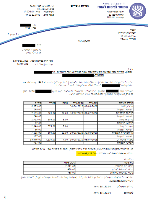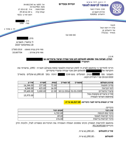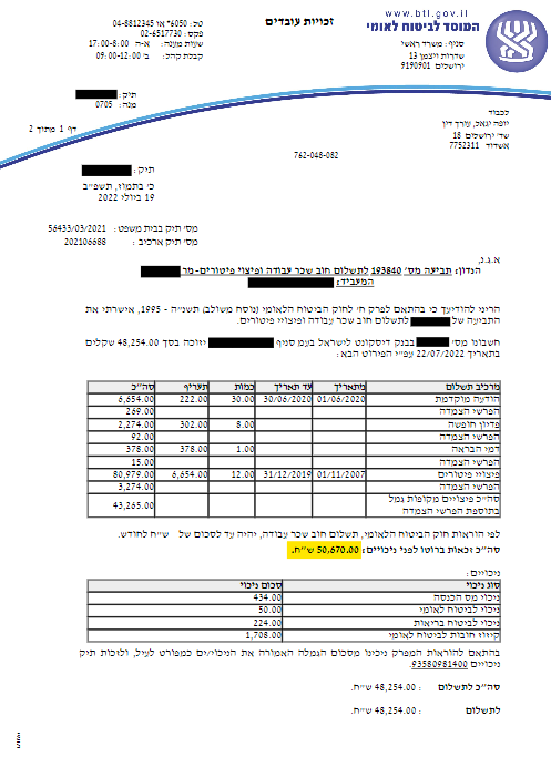 Відповідно до ізраїльського законодавства національне страхування захищає права найманих співробітників, у підприємства, які перебувають у стані банкрутства. Відповідно до законодавства працівник підприємства якому не було виплачено оплати, які роботодавець не зміг виплатити через фінансовий стан компанії – виплачує національне страхування (Бітуах леумі).