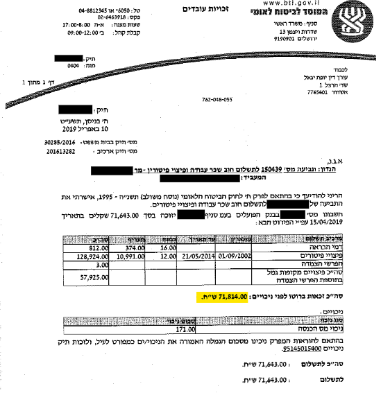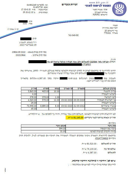 Максимальна сума виплат на 2023 рік становить 123 409 шекелів допомога за трудову компенсацію за звільнення та додатково 18 986 шекелів за несплату до пенсійного фонду.